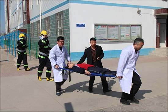 本次活動(dòng)假想新壘頭鎮(zhèn)中學(xué)學(xué)生宿舍樓三樓因線(xiàn)路設(shè)備老化發(fā)生火災(zāi),學(xué)生發(fā)現(xiàn)火情,迅速報(bào)告值班老師,值班老師到現(xiàn)場(chǎng)查看后通知值班室,然后迅速啟動(dòng)消防應(yīng)急預(yù)案,組織學(xué)生進(jìn)行緊急疏散。失火點(diǎn)位于三樓宿舍內(nèi),值班人員率先組織三樓學(xué)生進(jìn)行疏散,之后四樓值班人員聽(tīng)到廣播開(kāi)始組織學(xué)生疏散,五樓、二樓、一樓的學(xué)生在老師組織下依次有序疏散。經(jīng)過(guò)3分25秒,全校1100多名師生有序疏散完畢,趕到指定地點(diǎn)集合。 學(xué)校消防員接到火災(zāi)通知后迅速穿戴消防戰(zhàn)斗服及防煙面具,攜帶滅火器沖入火場(chǎng),處理初期火災(zāi)。因火勢(shì)太大,無(wú)法控制,通訊組匯報(bào)給校長(zhǎng),馮校長(zhǎng)立刻撥打了119火災(zāi)報(bào)警電話(huà)。得知一名同學(xué)昏迷,學(xué)校醫(yī)護(hù)人員迅速趕到宿舍樓,用擔(dān)架抬出昏迷學(xué)生,120急救人員立即進(jìn)行搶救。消防人員指導(dǎo)四樓被困學(xué)生用緩降器進(jìn)行自救,并派遣云梯車(chē)對(duì)樓頂學(xué)生進(jìn)行營(yíng)救。