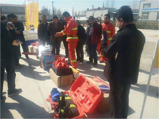 隨后河北國(guó)超消防設(shè)備科技有限公司提供消防器材展示,包含水基滅火器、25米鋼絲繩緩降器、自救呼吸器、應(yīng)急手電筒等設(shè)備,并由專(zhuān)業(yè)人員進(jìn)行講解。