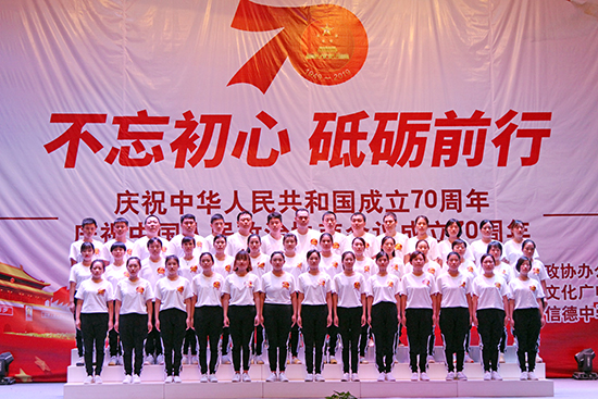 2019年9月20日,由辛集市政協(xié)辦公室、辛集市文化廣電體育和旅游局主辦,辛集市信德中學承辦的慶祝新中國成立70周年和中國人民政治協(xié)商會議成立70周年文藝演出在信德中學禮堂隆重舉行。 辛集市委副書記、政協(xié)主席姜�?怠⒄䥇f(xié)副主席崔文英、政協(xié)副主席陳貴房,文化廣電體育和旅游局局長馬懷建、市委辦副主任范士杰、教育局副局長姜彥華,民盟、民建、民革、九三學社、僑聯(lián)等民主黨派代表出席本次慶�;顒印:颖眹畔⒖萍加邢薰荆ㄒ韵路Q“我公司”)、河北申科電子股份有限公司、萬愛農業(yè)科技有限公司、河北天意行榮威4S店、辛集一街荷塘月色舞蹈隊、辛集市實驗學校、辛集市信德中學等單位的職工代表隊表演了精彩的節(jié)目。 我公司四十余名員工由總經(jīng)理曹艷爽親自帶隊,組成合唱團參加了本次演出。公司高層領導高度重視本次演出,為順利完成本次文藝演出,公司黨支部、工會與各部門負責人認真組織部署,共先后組織員工精心排演20余次。文藝演出在我公司42名員工激昂、深情的《我和我的祖國》大合唱中拉開序幕,接著我們演唱了熱情、歡快的《洗衣歌》,用歌聲表達了對黨和祖國的熱愛,把對黨的追隨凝聚成力量,用出色的演出詮釋了不忘初心、牢記使命的錚錚誓言,獲得在場觀眾和領導的高度贊譽。